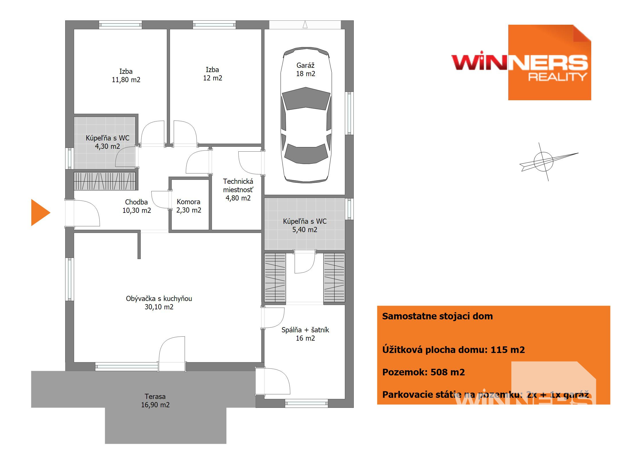 * krytá terasa: 16,90 m2 (možnosť úpravy na zimnú záhradu)