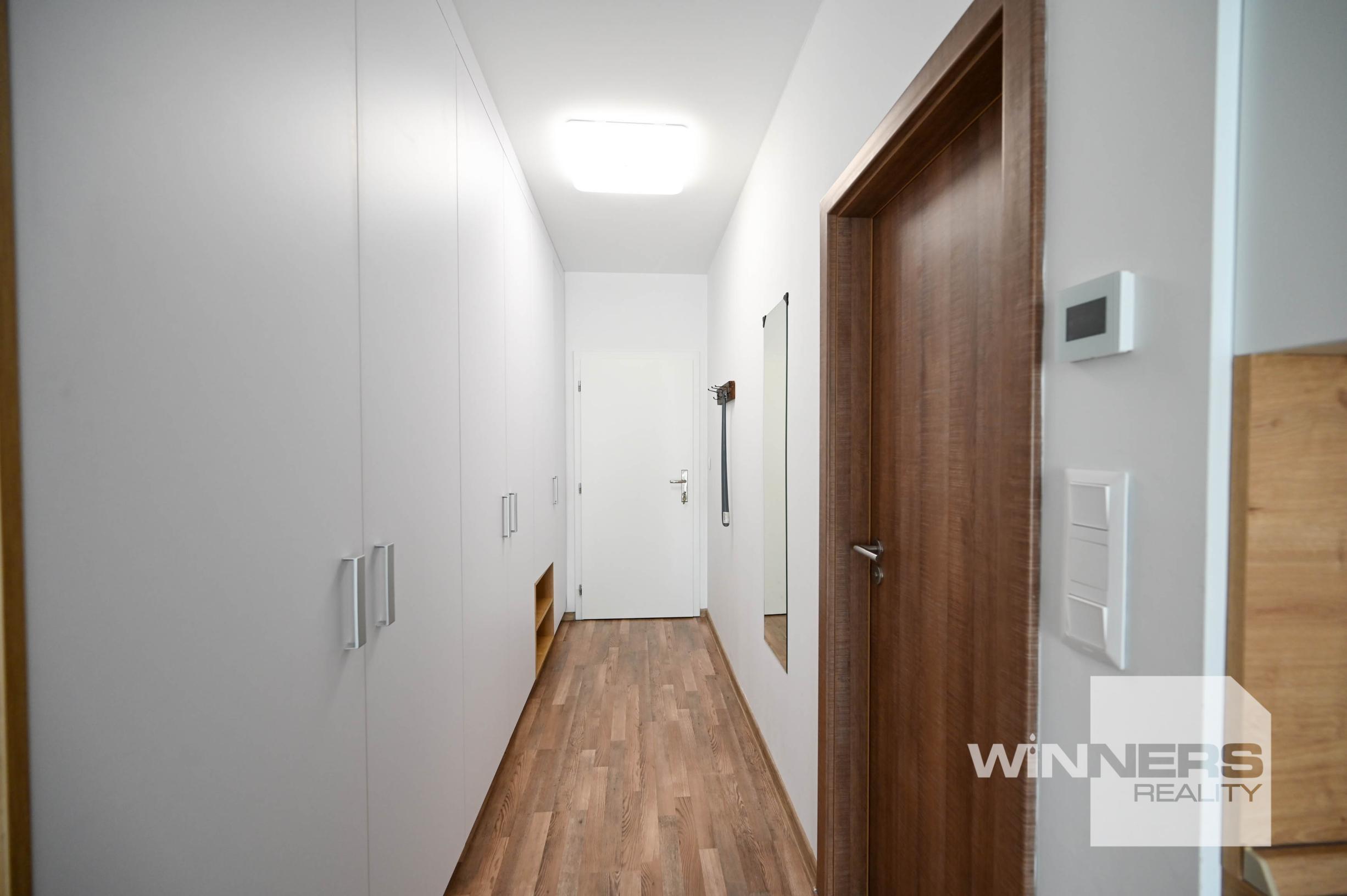 Vstupná časť apartmánu tvorí priestranná dlhá chodba, ktorá zabezpečuje pohodlnú cirkuláciu priestoru. Napravo sa nachádza veľká vstavaná skriňa, poskytujúca dostatok úložného miesta pre oblečenie, športové potreby či osobné veci.
