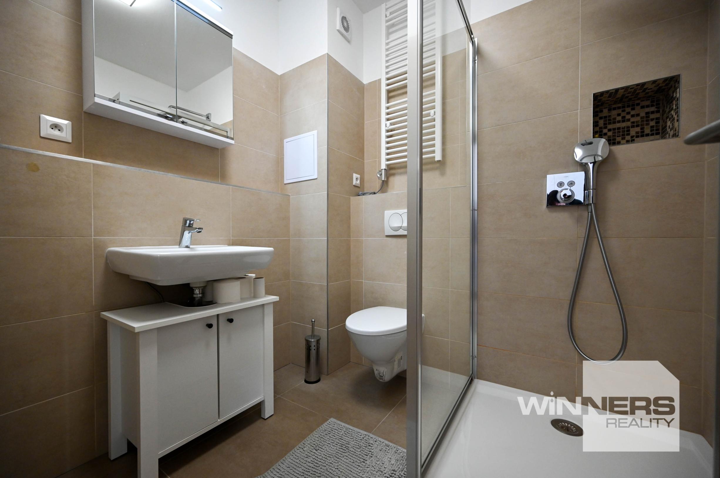 Oproti vstupu sa nachádza priestranná kúpeľňa s WC, vybavená sprchovým kútom a určená na komfortné využívanie aj pri dlhšom pobyte.