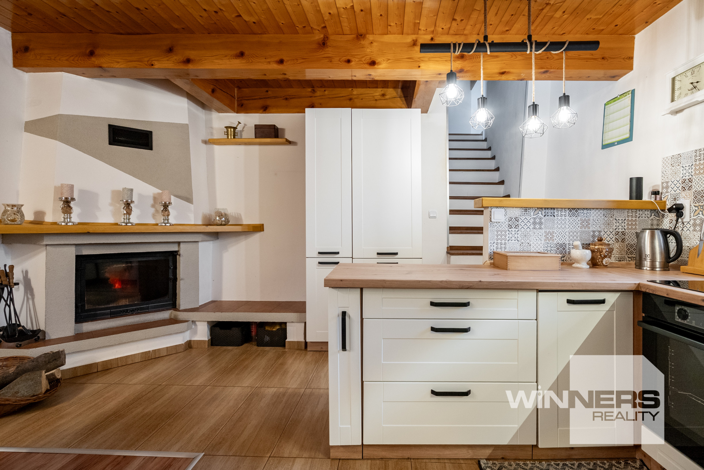 Vstup do domu je riešený cez zimnú záhradu, ktorá vytvára príjemný prechod medzi interiérom a exteriérom. Na prízemí sa nachádza kuchyňa s linkou na mieru so vstavanými spotrebičmi a krb, ktorý zabezpečuje vykurovanie domu. Súčasťou je aj priestranná kúpeľňa so sprchovacím kútom, toaletou a priestorom pre práčku a sušičku.