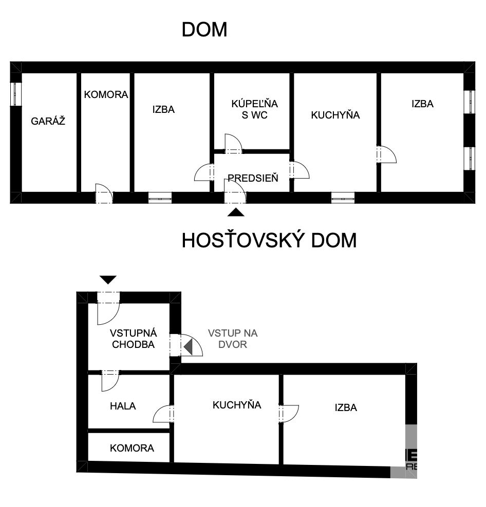 * 1 izbový (veranda, vstupná chodba, komora, kuchyňa, izba)
