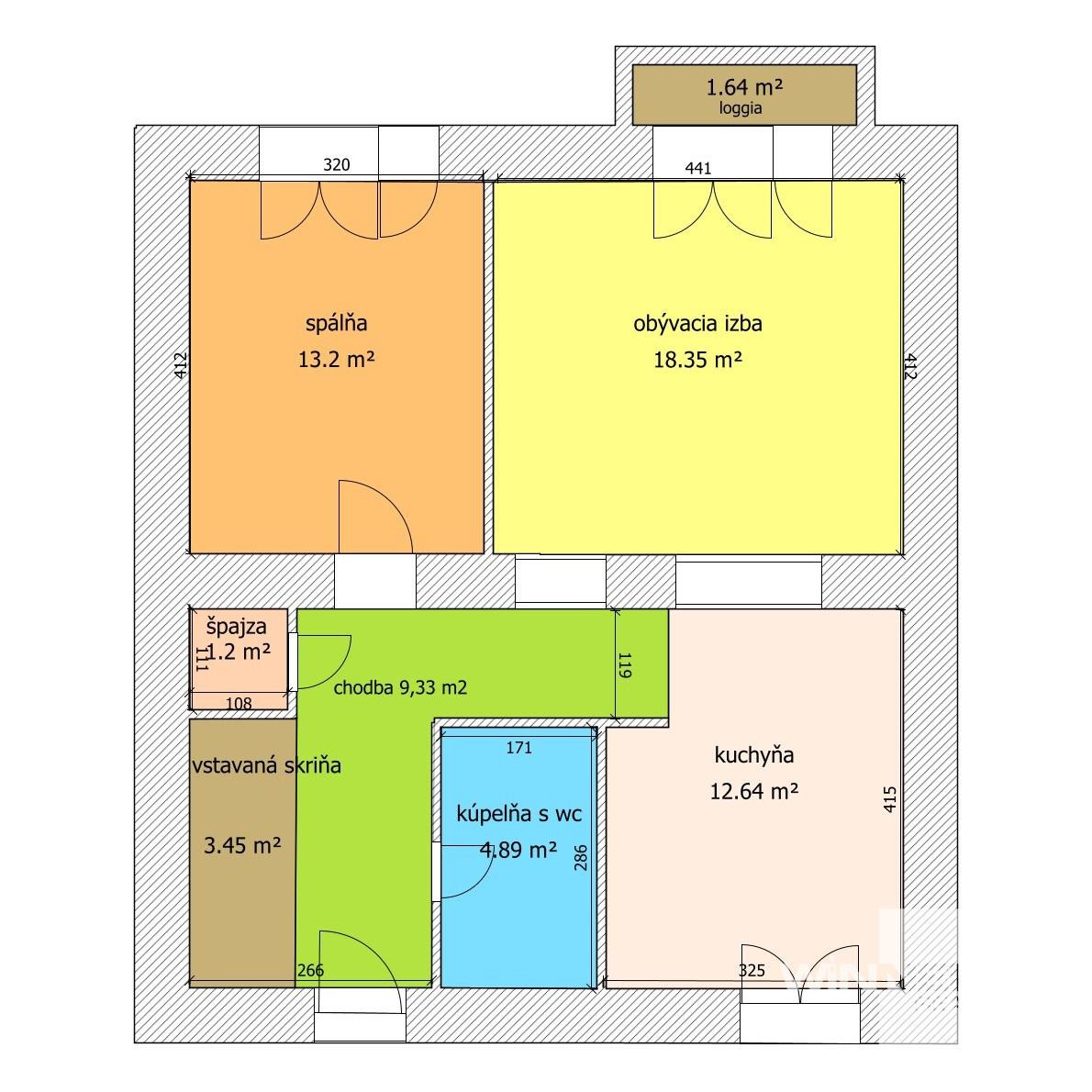 Celková výmera bytu vrátane loggie a pivnice: 67m2